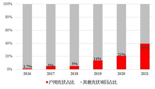 戶用光伏在光伏年新增裝機中的占比,也逐年提高;2021年一度還在那到39%!具體如下圖所示。